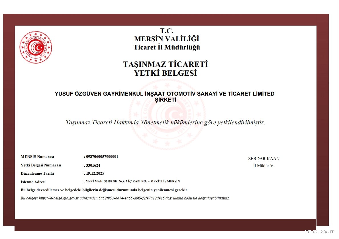 Taşınmaz Ticaret Yetki Belgesi No: 3301624